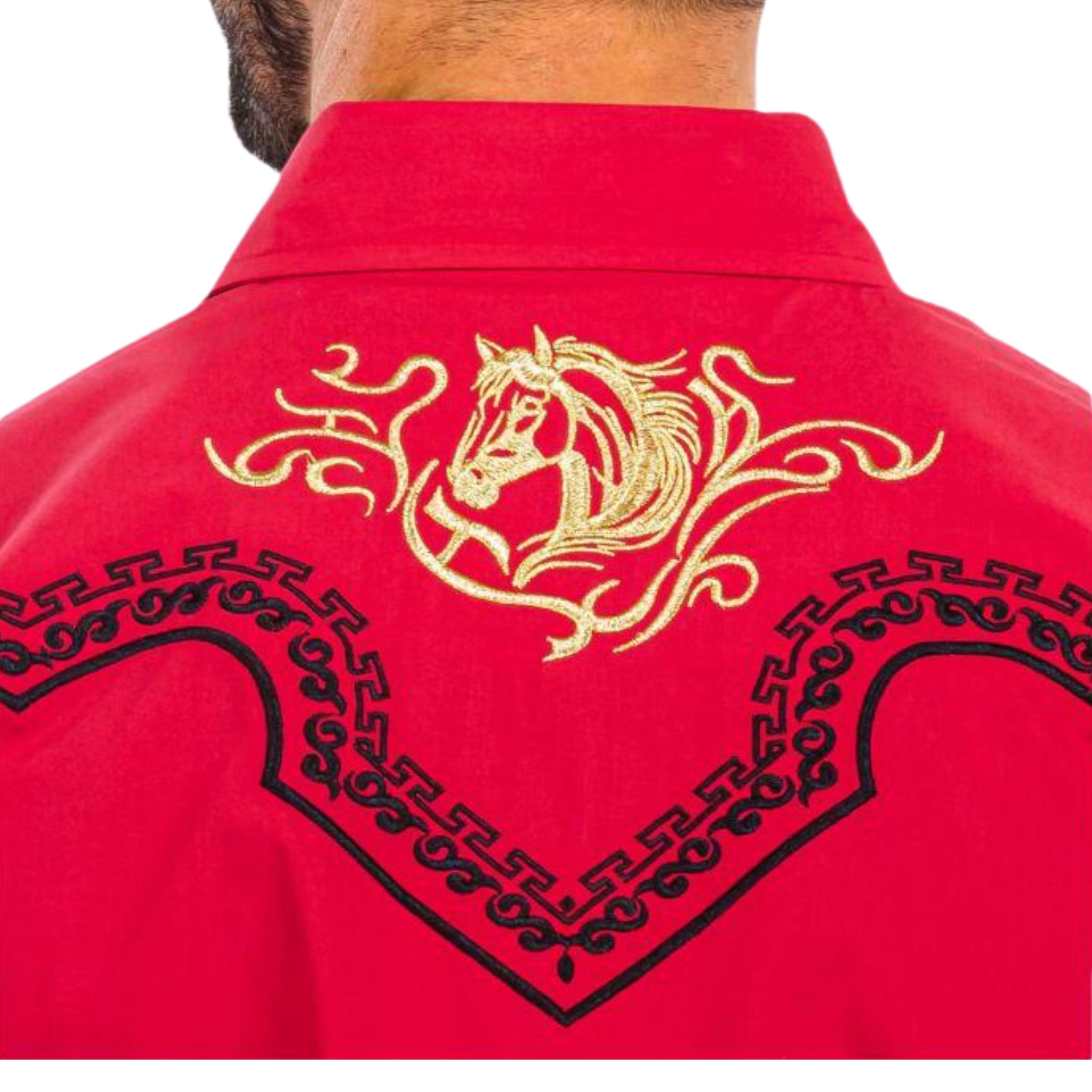 BUCKEROO SHIRTS: RED GOLDEN HORSE BLACK STITCH PEARL SNAP